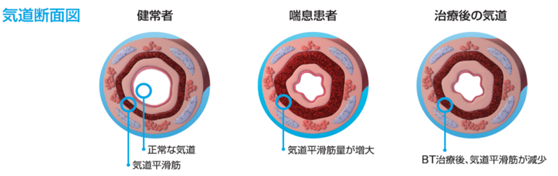 気管支喘息は、吸入ステロイド療法の普及により入院加療が必要となる症例が著しく減少しています。しかし、未だコントロールに難渋している症例もあります。重症難治性の気管支喘息に対して、IgEやIL-5の抗体といった分子標的治療薬の投与も行っています。また、2017年から気管支鏡を用いて気管支に高周波通電を行う気管支サーモプラスティも導入(広島県内では3施設のみ)しています。高周波通電により気管支壁を約65℃まで温めると、気管支壁内の平滑筋が薄くなります。このため難治性喘息により狭くなっていた気管支内腔を広がり、喘息症状を改善する治療です。1セット3回の治療を行うと、その効果は約5年持続するとされています。