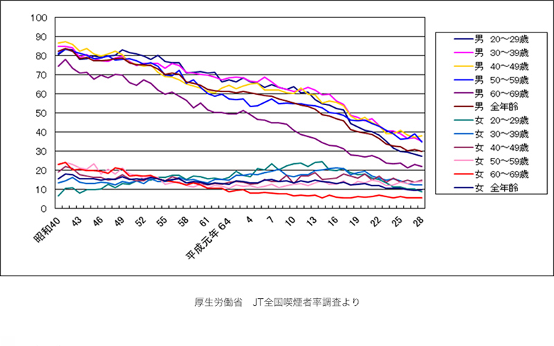 禁煙外来は、禁煙出来ずに困っている方を手助けする外来です。喫煙が健康を損なうということが周知され、下図のようにわが国での喫煙率は低下してきていますが、現実には禁煙したいと考えていても禁煙出来ない人もいます。肺癌や慢性閉塞性肺疾患(COPD)といった疾患では、喫煙と発病との因果関係が明らかであり、呼吸器内科の領域のほぼ全ての疾患では喫煙により病状が悪化してしまいます。
