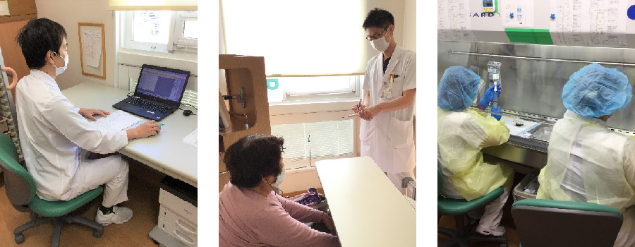 また、当院の外来化学療法室では、外来・入院で抗がん剤治療を受けられる患者さんすべての注射抗がん剤の調製を薬剤師が行っています。注射抗がん剤は、患者さんの治療内容や体格、検査値などの情報から抗がん剤の種類や投与量が適切か判断し、無菌環境下で量り取る必要があり、これらを専任の薬剤師が確認しています。また、当院の外来化学療法室にはクラスⅡタイプB2型の安全キャビネットを設置しており、抗がん剤の調製に関する知識と技術を習得した薬剤師が調製し、安全に治療を受けていただける体制を整えています。