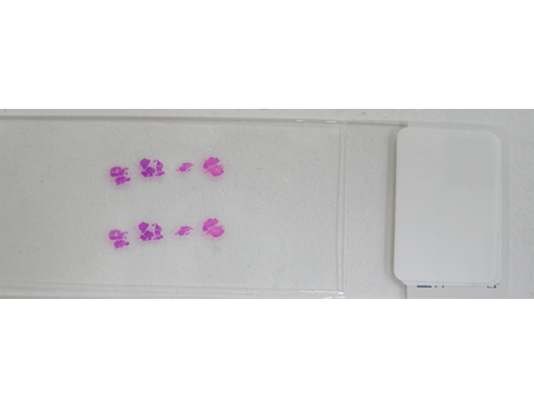 - 直接カセット法の流れ③包埋、薄切、染色、封入を経て、ガラス標本が出来上がる。