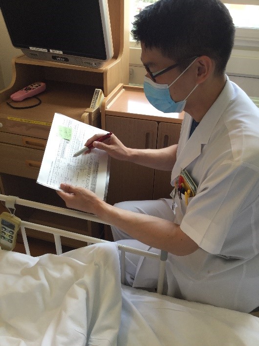 各病棟に薬剤師を配置し、入院患者さんに対して服薬指導(薬剤管理指導)を行っています。入院患者さんが、自分の病気について理解し、正しい知識を持って治療を受けていただくために、病棟薬剤師は、患者さんのベッドサイドへ伺い、内服薬、外用薬、注射薬の説明、自己注射・吸入薬の手技指導や薬の効果、副作用、飲み合わせのチェックなどを行い、医師・看護師と協議し、患者さんが安心して安全な医療が受けられるよう努めています。