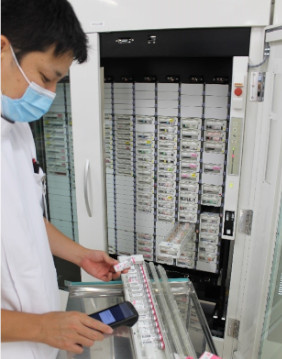 主に入院患者さんの注射薬の調剤を行っています。注射薬自動払出機を設置しており、充填している薬剤は患者さんごとのトレイへ自動で払い出されます。
