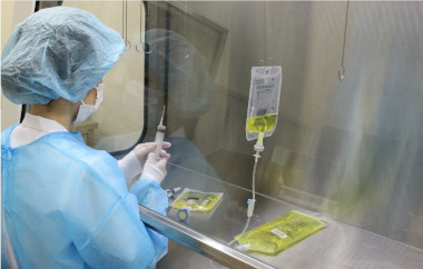 中心静脈からの栄養管理輸液の無菌調製は薬剤部内にあるクリーンベンチで行っています。平日は毎朝、処方変更がないか確認した上で調製しています。