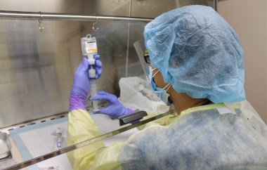 抗がん剤の無菌調製は、化学療法室にある安全キャビネットで行っています。治療当日に、医師より指示が出されてから調製を開始します。患者さん個々によってお薬の量が異なるため、調製時には薬剤師2人で1つ1つ確認を行い、正確かつ迅速に調製しています。