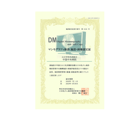 当院は、マンモグラフィ検診施設画像認定を取得しております。マンモグラフィ検診施設画像認定とは、「日本乳がん検診精度管理中央機構(精中機構)」が、書類審査、画質評価、線量評価を行い、基準を満たしている施設を評価するものです。