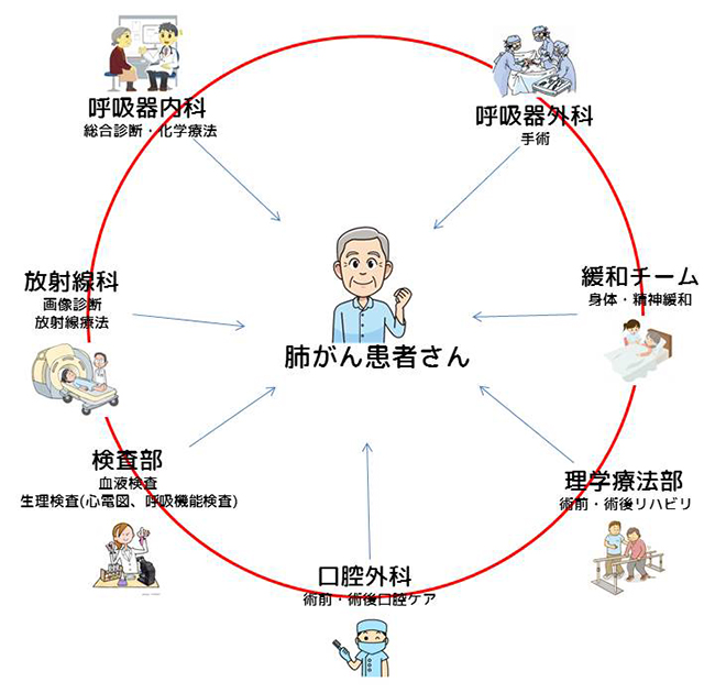 呼吸器内科、放射線科、リハビリテーション科との連携を保ちながら、術前から術後までより包括的な診療を行うように心がけています。